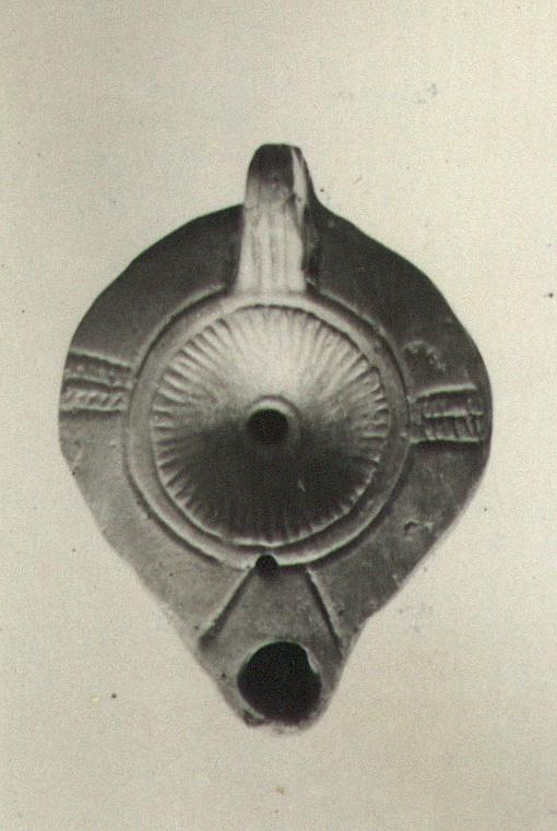 | Description: | Complete. The handle grooved; solid. Plain panelled rim; rays on the discus. On the bottom a palm leaf within two rings. Brownish clay. Type XXVIII of Corinth collection. | |