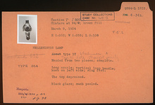 | Description: | Mended from two pieces; complete. Long nozzle; vertical loop handle; knob on left side; ring foot. The top depressed. Wheel made A. Black glaze; much peeled. Type XII (late straight variety) of Corinth collection, type 35A of Agora collection. | |