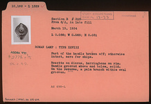 | Description: | Part of the handle broken off; otherwise intact, save for chips. Rosette on discus, herringbone on rim. Handle grooved above and below, solid. On the base, a palm branch within oval grooves. Type XXVIII of Corinth collection. Cf. L 698. | |