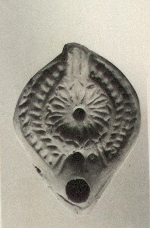 | Description: | Part of the handle broken off; otherwise intact, save for chips. Rosette on discus, herringbone on rim. Handle grooved above and below, solid. On the base, a palm branch within oval grooves. Type XXVIII of Corinth collection. Cf. L 698. | |