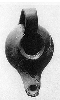| Description: | Most of the upper part of the body missing. Round body, with high outward flaring rim around the filling hole. No base. The nozzle is flat on top as in lamps of type VII of Corinth collection. Black glazed all over, peeling. Wheel made D. Type XV or XII of Corinth collection, type 36B of Agora collection. Cf. Agora IV, nos. 488-490, pp. 116-117, pls. 18, 44. Corinth IV, ii, pp. 55-56, no. 195, pl. V. ADDENDA: Slight traces remain of lower handle attachment, groove around upper part of body, restored. | |