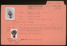 | Description: | Much of the side wall is missing. Flat bottom; side wall bulges slightly toward bottom; filling hole surrounded by raised rim; nozzle has blunt, slightly flaring end. Red flaky glaze. Buff clay. Type X of Corinth collection, type 39 of Agora collection. | |