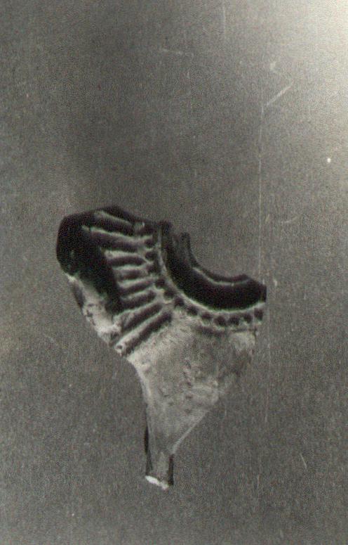 | Description: | There remains only a fragment of the upper part. Convex side wall; filling hole surrounded by groove; around the groove a line a of raised dots and on the shoulder, ribs. On the left side an unpierced knob. Flaky glaze, mottled black and red. Mold made. Type XVIII of Corinth collection, type 48A of Agora collection. | |
