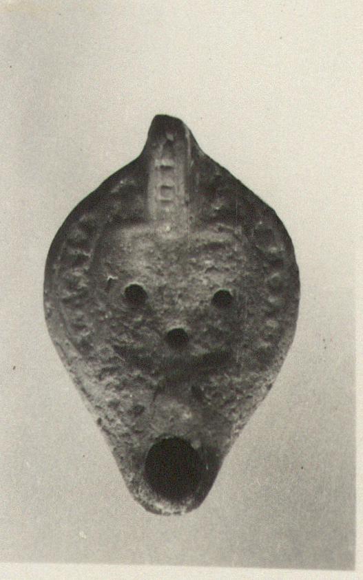 | Description: | Intact, but the surface flaky. On the discus, a bird, left. Impressed circles on the rim, Solid grooved handle. The sides nearly straight, but not quite vertical. On the back, impressed circles and oval grooves. Light red clay, unglazed. Type XXVIII of Corinth collection. Cf. Corinth IV, ii, pp. 102-114, nos. 786-1412, pls. XIII-XIX. | |