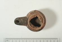 | Description: | The knob at the left broken away and the edge of the rim chipped; otherwise intact. Glaze, poor black to reddish brown. Type 25B of Agora collection, type VII of Corinth collection. Cf. Agora IV, nos. 301-317, pp. 72-74, pls. 10, 23, 38. Corinth IV, ii, pp. 45-46, nos. 114-136, pl. III. | |