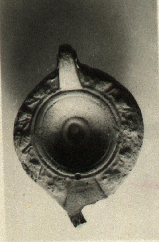 | Description: | Part of the nozzle lacks. Plain rim; vine pattern on discus; the handle semi-pierced. Two concentric grooves on the bottom, enclosing the signature "EYX". Unglazed; whitish to pink slip on the outside. Coarse gritty clay. Type XXVII of Corinth collection. | |