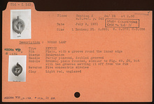 | Description: | Rim, plain, with a groove around the inner edge. On discus, boukranion. Handle partly pierced, double grooved. Nozzle broken; plain rounded, with two grooves setting it off from the rim. On reverse, five concentric circles. Unglazed. Light red clay. Type XXVIII of Corinth collection. ADDENDA For nozzle cf. Corinth IV, ii, p. 105, fig. 49, no. 6. | |