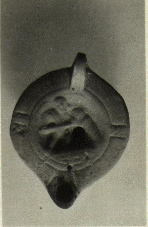 | Description: | Complete. Plain panelled rim. On the discus, a man, facing right, attacking some indistinguishable animal with a spear. Gladiatorial scene (?). The handle semi-pierced; on the bottom, two concentric grooves. Unglazed; traces of white slip (?). Pink clay. Type XXVIII of Corinth collection. | |