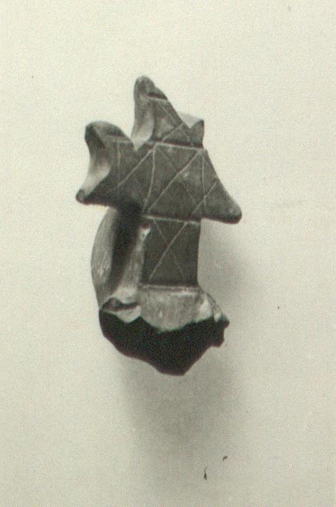 | Description: | Broken to the right. The handle behind the shield is a solid knob, plain. The clay is dark gray, with a gray slip (?). Late Roman. | |