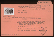 | Description: | Most of the mold for the top of the lamp, (edges broken) is preserved. It shows a plain, slightly sunken top, bordered by a groove, and a side lug. On the bottom is incised in wet clay, a covered pyxis with sprays sticking out of it. Buff clay with good surface. For lamp of type 43D of Agora collection. | |
