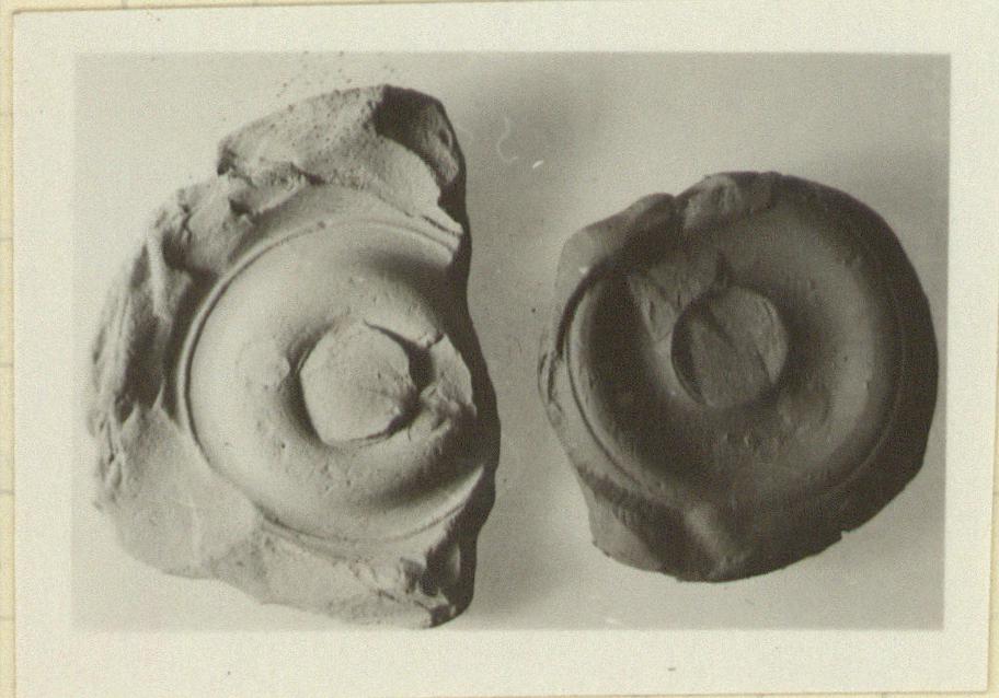 | Description: | Most of the mold for the top of the lamp, (edges broken) is preserved. It shows a plain, slightly sunken top, bordered by a groove, and a side lug. On the bottom is incised in wet clay, a covered pyxis with sprays sticking out of it. Buff clay with good surface. For lamp of type 43D of Agora collection. | |