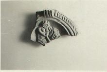 | Description: | A piece from the top, with part of the herringbone rim, and the triple grooved handle. On the discus, a human figure struggling with a lion; Herakles (?). Unglazed. Brownish clay. Type XXVIII of Corinth collection. | |
