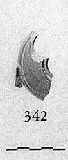 | Description: | Only a fragment from the top and side is preserved. The side wall is almost vertical; the rim is broad and flat, rising slightly toward the middle. Around the filling hole it terminates in a depressed shoulder, and it is set off from the side wall by a groove. Pierced knob on the side. Thin black glaze covers the inside; the outside is polished but unglazed. Type VIII (domed variety) of Corinth collection, type 25C' of Agora collection. ADDENDA Combines features found in Types VII and VIII of Corinth collection. Cf. Hesperia 3 (1934), no. A 46. | |