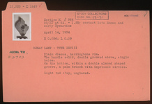 | Description: | Plain discus, herringbone on rim. The handle solid, double grooved above, single below. On the bottom, within a double almond-shaped groove, a palm branch with impressed circles. Unglazed. Light red clay. Type XXVIII of Corinth collection. | |