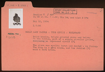 | Description: | Solid handle, triple grooved above and below. On the bottom, part of a single circular groove, enclosing an impressed circle (?). The piece was spoilt, burnt and dented, in firing. The clay is a poros black, and the reddish (?) wash a dark brown. Type XXVIII of Corinth collection. | |