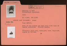 | Description: | Part of the bottom and back wall with base of handle preserved. Grooved handle. Signed on bottom: "ΠΑ". Unglazed. Micaceous pink clay. Type XXVIII of Corinth collection. | |