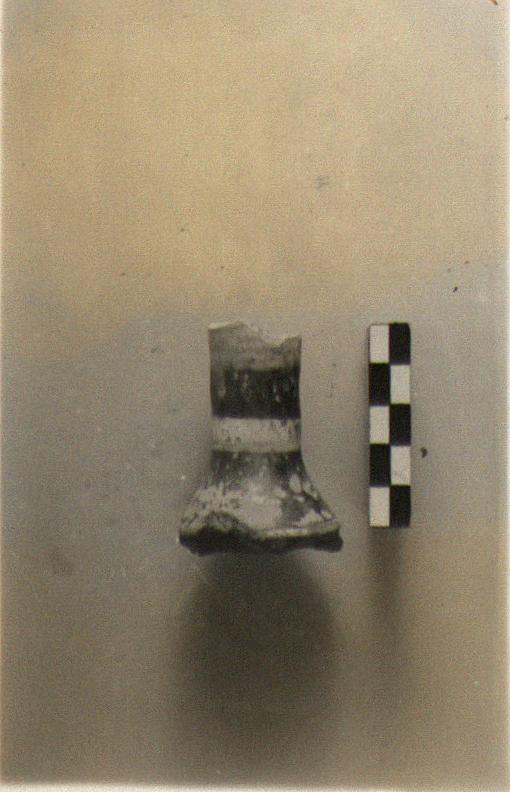 | Description: | Part of a lamp on a high columnar stand, broken off below, and above the base of the lamp. Cylindrical stand, decorated with three horizontal bands in white paint (west slope decoration). Glazed black; much peeled. Fine, pinkish-buff clay. Type IX (?) of Corinth collection, type 33B of Agora collection. | |