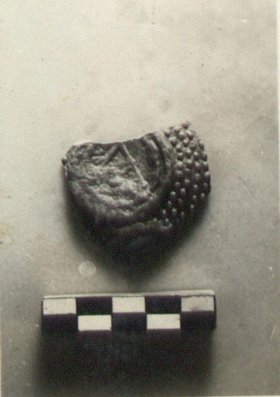 | Description: | Only the bottom with the letter A, smudged below, the spring of the nozzle and part of the side walls with raised dots preserved. Hard red clay. Thin purplish glaze. Type XX of Corinth collection. Cf. Corinth IV, ii, pp. 70-73, nos. 372-382, pl. VII. | |