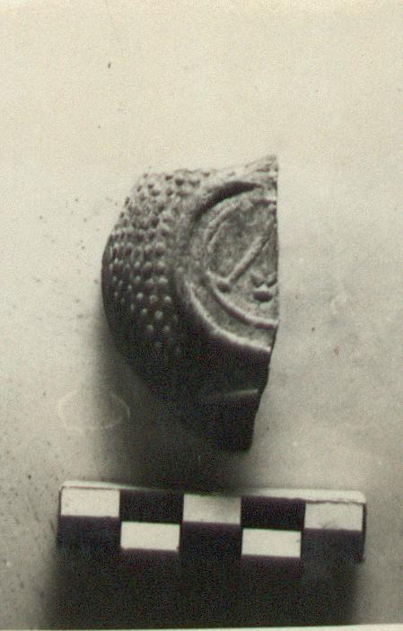 Description:   Half the bottom, most of one side wall with raised dots, and the spring of the nozzle preserved.
