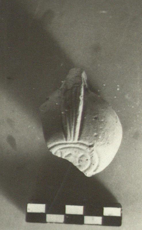 Description:   Back part of lamp only preserved, with unpierced, grooved handle, rim fragment with pattern of dots, parts of walls and base.