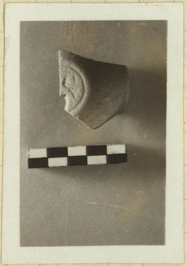 | Description: | A single fragment preserves part of the wall and bottom of a lamp. Beneath, within a single groove, the signature. Light buff slip. Pinkish-buff clay. Type XXVII of Corinth collection. <graphic> | |
