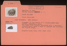 | Description: | Fragment of the bottom of a closed-mould made vessel, probably a lamp. The large flat bottom, decorated with a central rosette about which a band of pattern and grooves. The inside rough. Light slip. Grayish-brown clay. Type XXVIII (?) of Corinth collection. | |