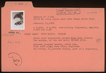 | Description: | About half preserved. Mended from many pieces. Two scraps, of rim and wall, do not join. Grooved pierced handle, plain rim. On bottom, in grooved circle, part of a signature: "Ο Γ Ο Υ" Fine buff clay, very thin, unglazed. Type XXVII of Corinth collection. Cf. Corinth IV, ii, pp. 90-102, nos. 545-785, pls. XI-XII, XXVI-XXIX. <graphic> | |