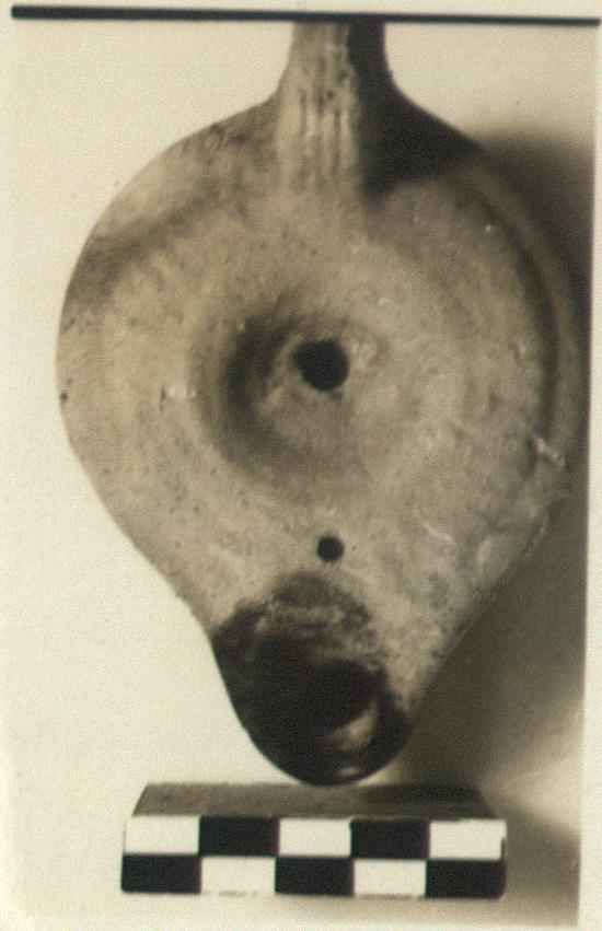 | Description: | Intact. Small plain discus. Raised dots on rim. Handle, partly pierced, grooved above and below. Raised dots on the body. Concentric grooves on bottom. From very worn mould. Micaceous orange clay and slip. Type XXVIII of Corinth collection. | |