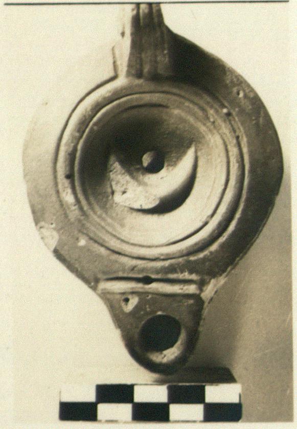 | Description: | Part of the left side of the body missing; otherwise intact. Crescent on discus. Rim plain. Handle partly pierced; grooved above and below. On reverse, concentric grooves. Thin reddish-brown glaze, flaked. Buff clay. Type XXVIII of Corinth collection. | |
