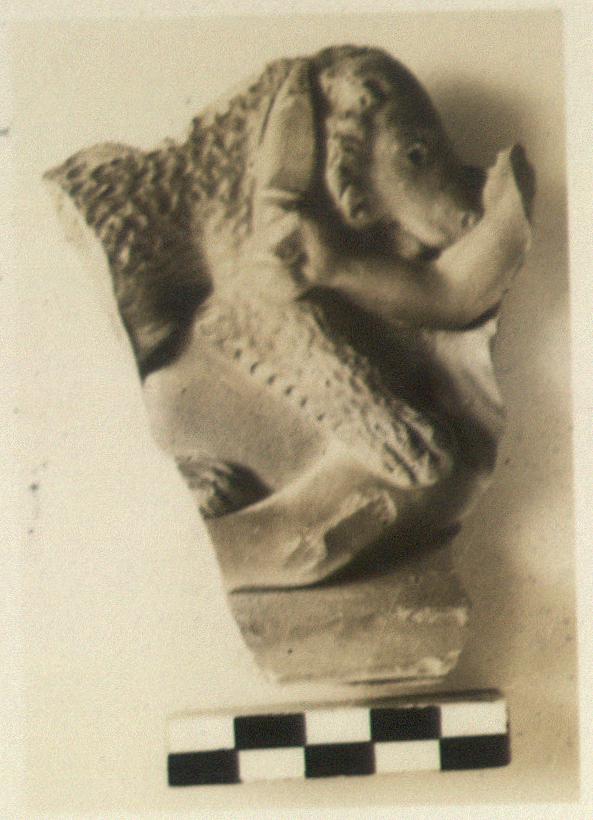 | Description: | Fragment of the discus of a large lamp (?). A bear attacks a man. The foreparts of the bear and one leg and an arm of the man, with short sword, are preserved. Red glaze, on the top, a little along one edge of the under side. The bear's eyes pierced. Micaceous orange clay. Type XXVIII of Corinth collection. | |