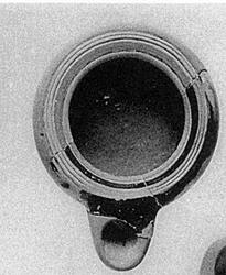 | Description: | Much of nozzle, base and wall missing. On flattened rim are four shallow grooves. Flaky black glaze, two reserved bands on rim. Type V (variants of the 5th. century) of Corinth collection, type 22C of Agora collection. | |