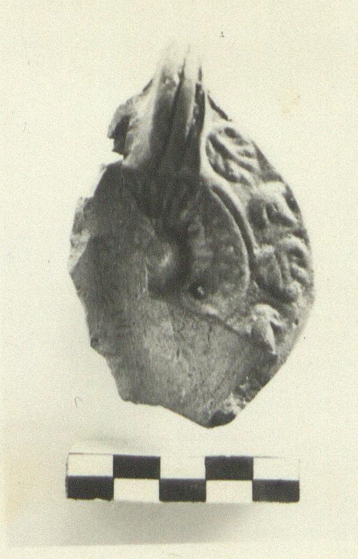 | Description: | Nozzle and left side missing. The rim is ornamented with a leaf and cluster pattern, the sunken discus with rays. Solid grooved handle. On bottom, enclosed in circle: "XIO NHC". The clay is coarse red, burned black on the upper part. Type XXVIII of Corinth collection. | |
