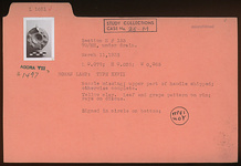 | Description: | Nozzle missing; upper part of handle chipped; otherwise complete. Leaf and grape pattern on rim; rays on discus. Signed in circle on bottom. Yellow clay. Type XXVII of Corinth collection. <graphic> | |