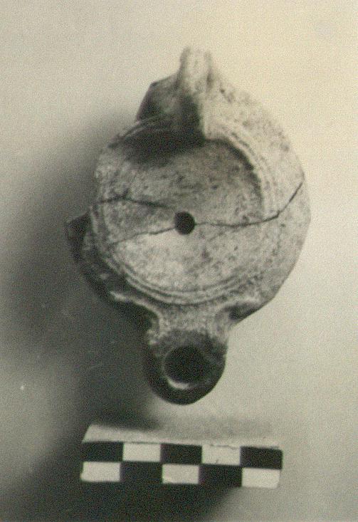 | Description: | Broken but practically complete. Plain discus, separated from outward sloping rim by two grooves and row of tiny raised dots. Nozzle rounded, with volutes encroaching on rim. Moulded handle with large hole and single groove above. On bottom, a low base ring. Thin brownish glaze on exterior. Hard grayish-yellow clay. Type XX of Corinth collection. | |
