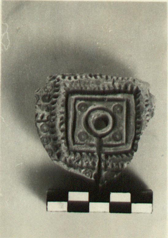 Discus is square, and separated by a ridge from rim. In each corner of the inner square a small impressed circle. A narrow channel around the filling hole leads through the ridge toward the nozzle. Rim has a pattern of circles and degenerate herringbone.