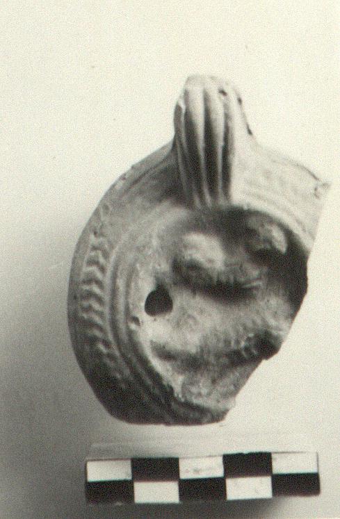 | Description: | Handle, about half the rim, two-thirds of disk and small part of base preserved. Herringbone pattern on rim; on discus, bear left; a swaddled human being in the field above. Part of letter on base, perhaps "E". Thin purple wash. Brown clay. Type XXVIII of Corinth collection. | |