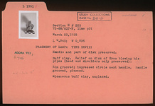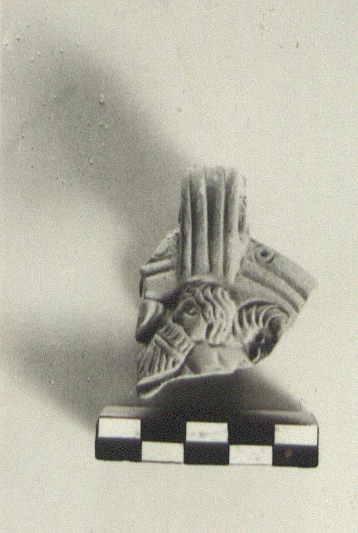 | Description: | Handle and part of disk preserved. Relief on disk of Eros, blowing his pipes (head and shoulders only preserved). Rim grooved; impressed circle next handle. Handle grooved, pierced. Unglazed. Micaceous buff clay. Type XXVIII of Corinth collection. | |
