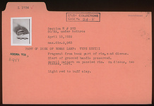| Description: | Fragment from back part of rim, and discus. Start of grooved handle preserved. Scroll pattern on panelled rim. On discus, two fishes, left. Light red to buff clay. Type XXVIII of Corinth collection. | |