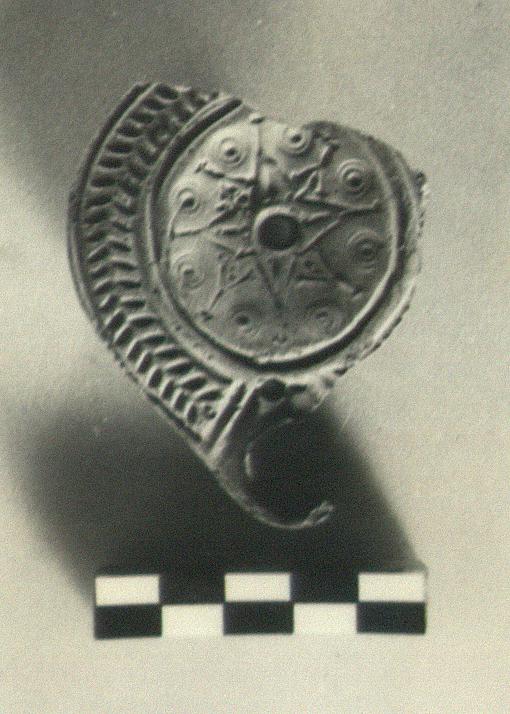 | Description: | Fragment from top of lamp; discus and part of rim and nozzle are preserved. On discus, an elaborate star pattern incised, with small concentric circles. On rim, herringbone. Unglazed. Orange clay. Type XXVIII of Corinth collection. | |
