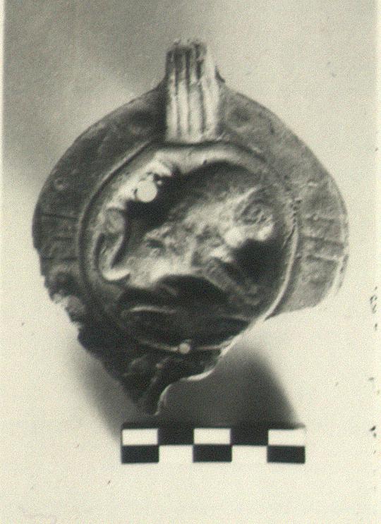 | Description: | Fragment preserves most of the top of a lamp; part of nozzle broken away. On discus, a lion right. Rim, plain with three grooves at panels. Handle unpierced; triple groove above, double below. Purple wash. Type XXVIII of Corinth collection. | |