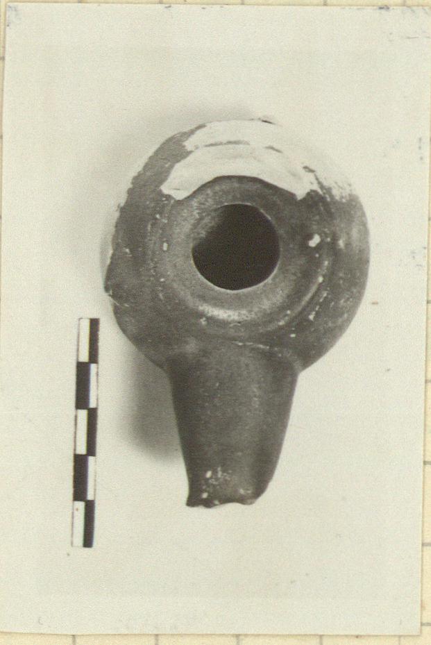| Description: | Vertical handle and end of nozzle missing. Low base, rising slightly toward the center. Unpierced knob on one side of upper body. Plain slightly sunken top. Wheelmade. Buff clay; dull black glaze, somewhat peeled. Type 35A of Agora collection, type XII (late straight variety) of Corinth collection. . Cf. Agora IV, nos. 467-471, pp. 109-110, pls. 17, 43. Corinth IV, ii, pp. 52-53, nos. 183-189, pl. IV. | |