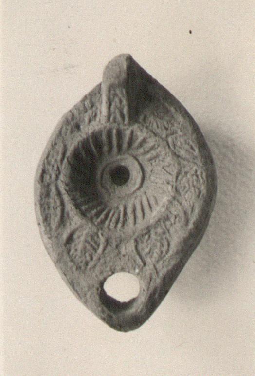 | Description: | Reverse broken; handle damaged. On rim, leaf pattern. Very concave discus, with crude rays and band round central filling hole. Handle solid, double grooved. Nozzle rounded. On reverse, remains of single almond-shaped groove. Unglazed. Ligh red clay. Type XXVIII of Corinth collection. | |