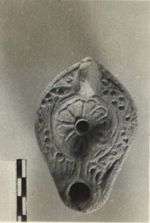 | Description: | Unpierced, ungrooved handle. On base, palm branch in oval grooves, with impressed circles. Disc decorated with rosette, rim with round holes. Type XXVIII of Corinth collection. ADDENDA Late: near type XXIX of Corinth collection. | |