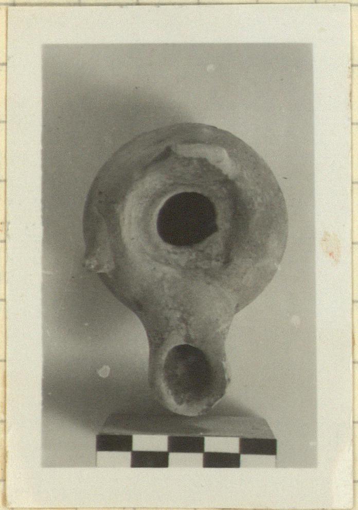 | Description: | Vertical strap handle missing. Unpierced knob on one side of double convex body. Small, slightly sunken top. Flat bottom; no base. Gray to buff slightly micaceous clay; traces of dull black glaze, nearly all peeled. Type 34A of Agora collection, type XII of Corinth collection. Cf. Agora IV, nos. 445-456, pp. 104-106, pls. 16, 24, 42. Corinth IV, ii, pp. 52-53, nos. 183-189, pl. IV. | |