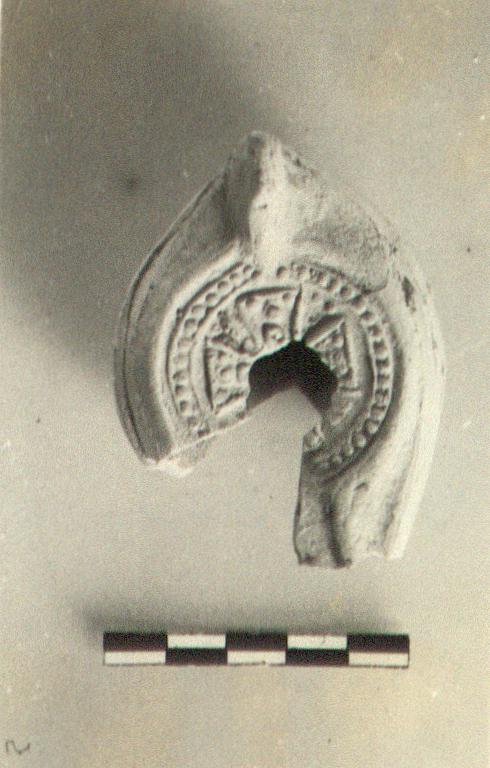 | Description: | Nozzle, and part of rim, disk and base missing. Plain sloping rim. On the discus, a jewelled cross with a circle of small dots. Small solid knob handle, connected with the bottom by a raised line. Small raised ring base, with a raised circle inside it. Unglazed. Yellow-buff clay. Type XXXI of Corinth collection. | |