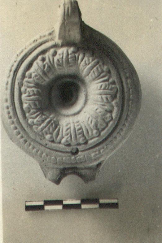 | Description: | The end of the nozzle missing; enough remains, however, to show that it projected from, rather than intruded into, the rim. The partially pierced handle has two grooves. The rim has a single line of dots around it; on the disc, a leaf and dot pattern. The bottom of the lamp is ornamented with five concentric circles, two of which are on the lower portion of the sides, three on the indented surface of the bottom. Unglazed. Red clay. Type XXVII variant of Corinth collection. | |