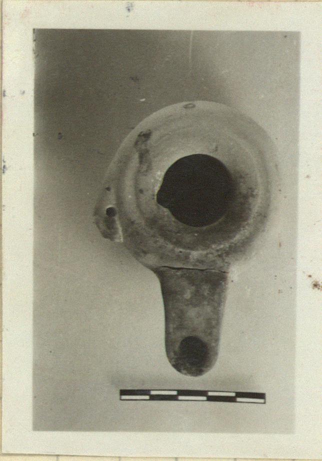 | Description: | The nozzle is missing. Low base, rising beneath. Semi-pierced lug on one side of body. No handle. Outside unglazed, inside, brown glaze. Pinkish-buff clay. Type VIIB (?) of Corinth collection, type 25B' of Agora collection. | |