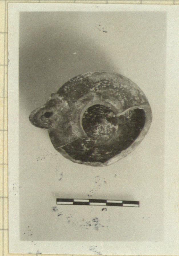 | Description: | The nozzle and most of the right side of the body missing. Raised base, rising slightly beneath. Nearly straight side wall, curving into plain top; a depressed and a raised ring around the filling hole. Large pierced lug. Reddish-brown clay. Wheel made. Thin brownish-black glaze. Type VIIA of Corinth collection, type 25 variant of Agora collection. | |