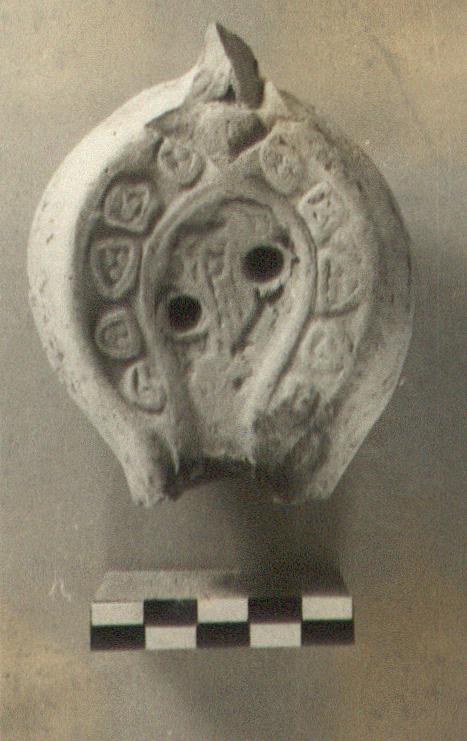 | Description: | The handle and nozzle missing. Rim set slightly lower than the top of the sides is ornamented with a row of geometric motifs. On the discus, a bird in relief, perhaps an eagle (?). The base defined by a low ring, from which a raised band leads to the back of the handle. Unglazed. Clay pink at the core, yellowish-gray at the surface. Type XXXI of Corinth collection. | |