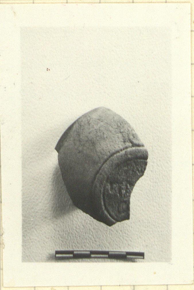 | Description: | The side and part of the bottom preserved. The bottom marked by two concentric grooves; the space between slightly raised. Inscribed inside. Unglazed. Coarse greenish-buff clay. Type XXVII of Corinth collection. <graphic> | |